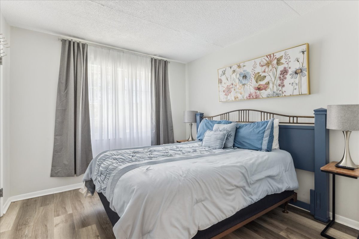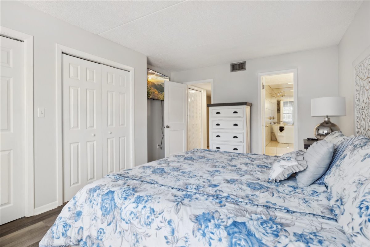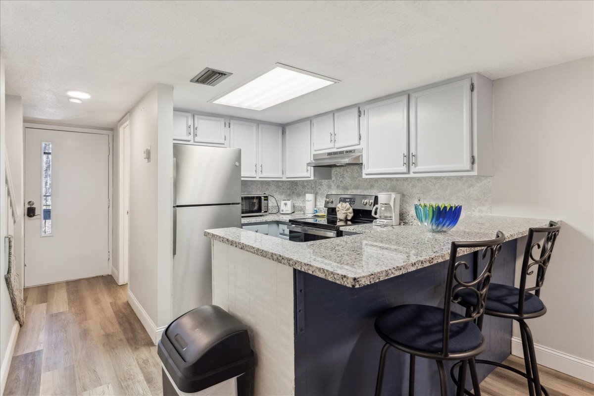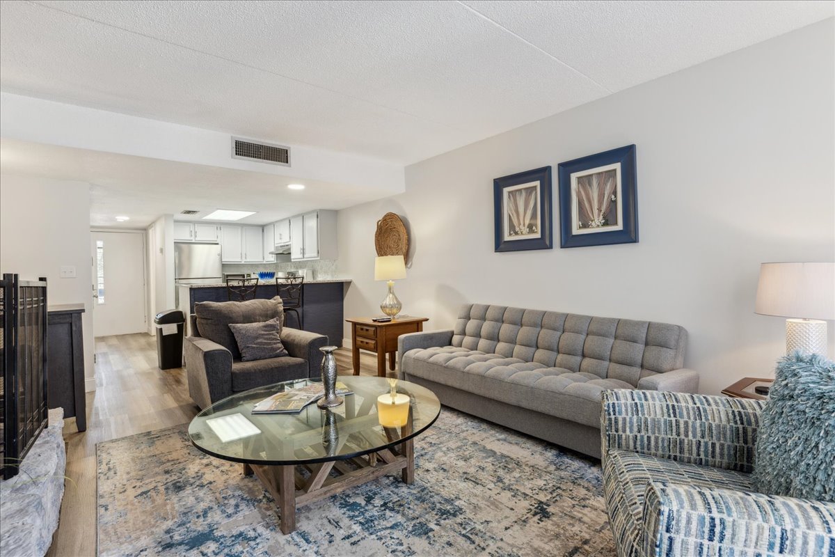 Designed for comfort and style, the condo comfortably sleeps 4 guests, with a spacious primary bedroom featuring a king bed and a second bedroom offering a cozy full bed. Both rooms are beautifully appointed with modern furnishings and hardwood floors throughout the entire condo. This is a two-level condominium, both bedrooms are upstairs, with the kitchen, living, dining, and balcony on the entry level.