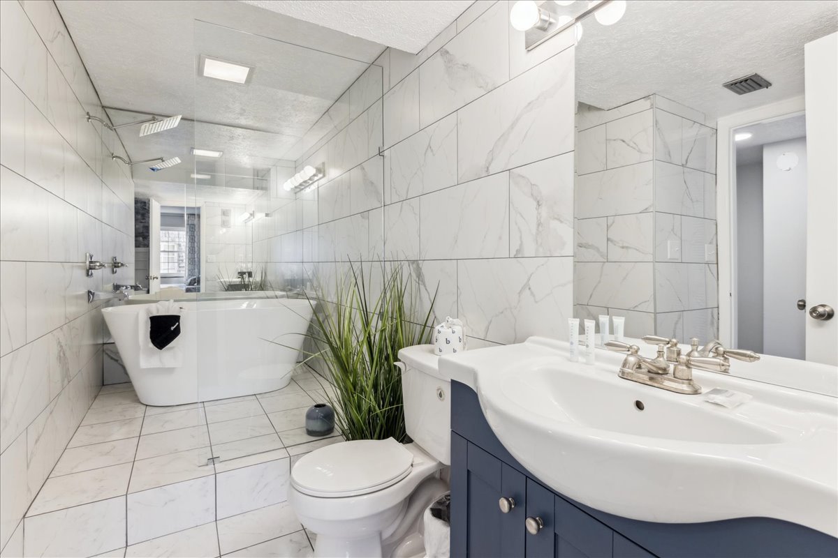 The primary bathroom is a luxurious retreat, offering both a soaking tub and a shower, while the second bathroom features a convenient walk-in shower. Every detail in this condo has been carefully designed with beautiful, modern furnishings to provide an inviting and comfortable atmosphere.