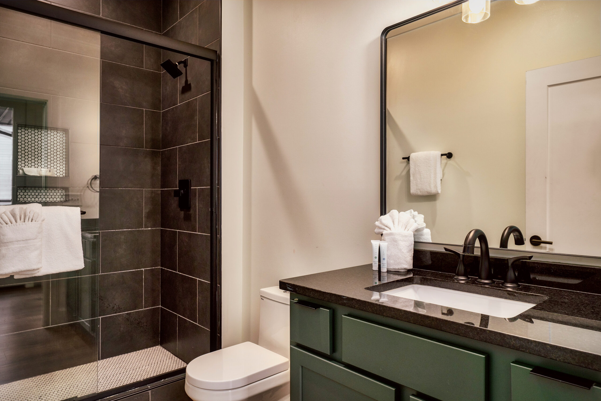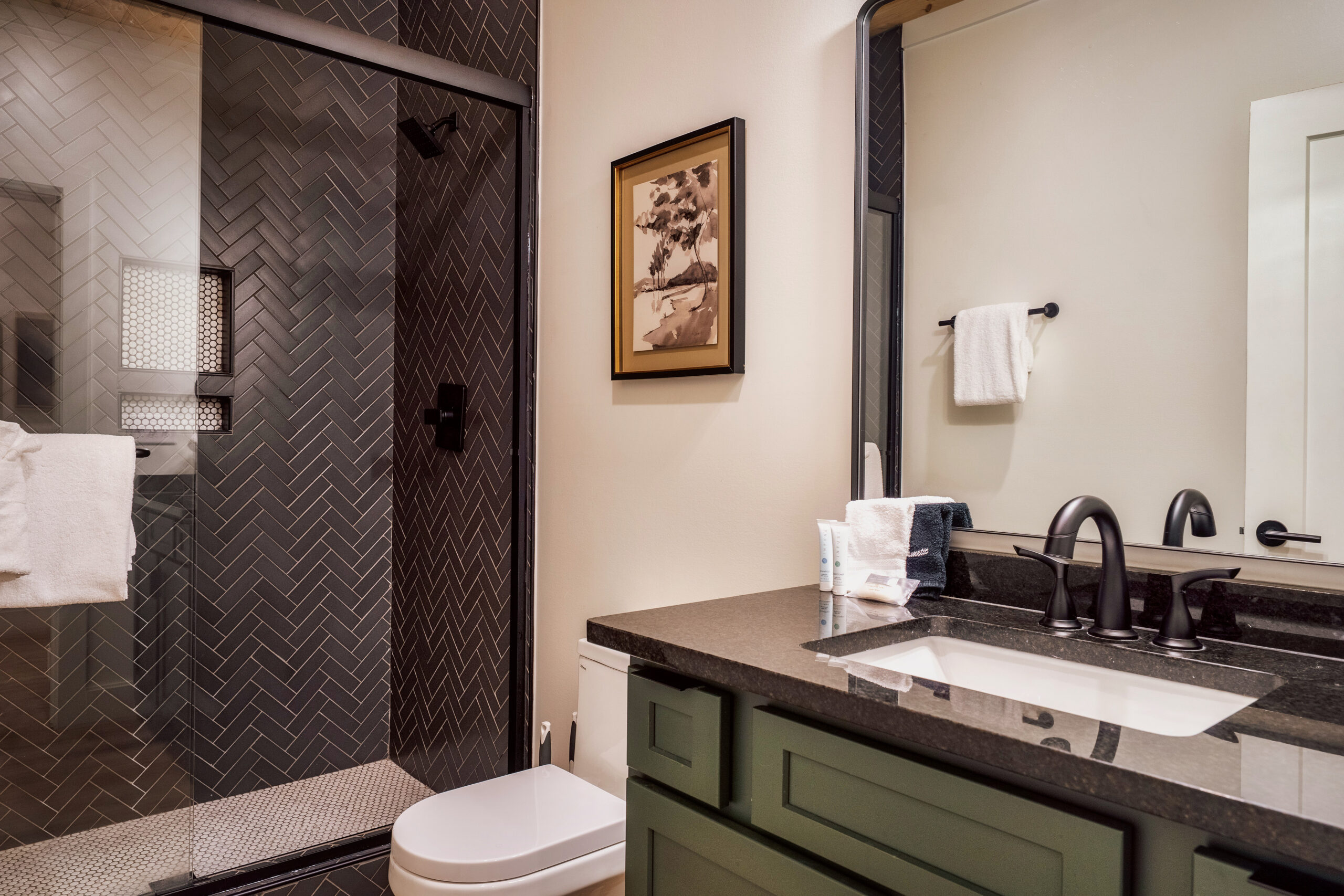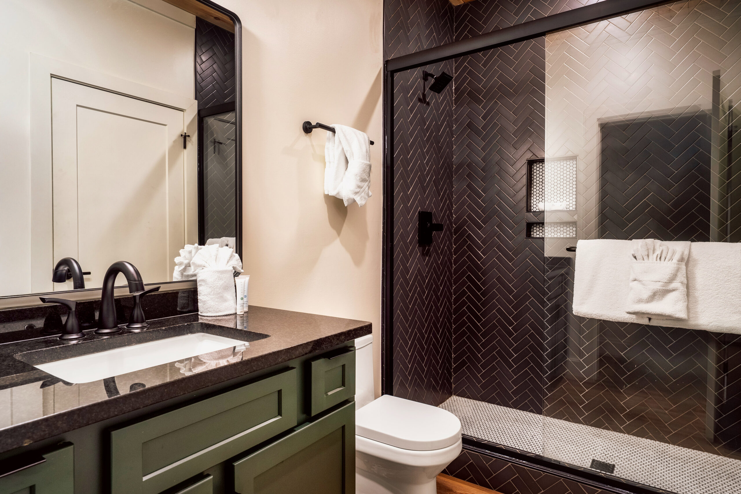 The open-concept cabin boasts a fully equipped kitchen, a spacious dining area, and a beautifully appointed living room with large windows to take in the breathtaking mountain views. For entertainment, enjoy the game room complete with a pool table, arcade games, and more. There’s also a cozy theater room with large futon-style sofas that can sleep two, perfect for movie nights.