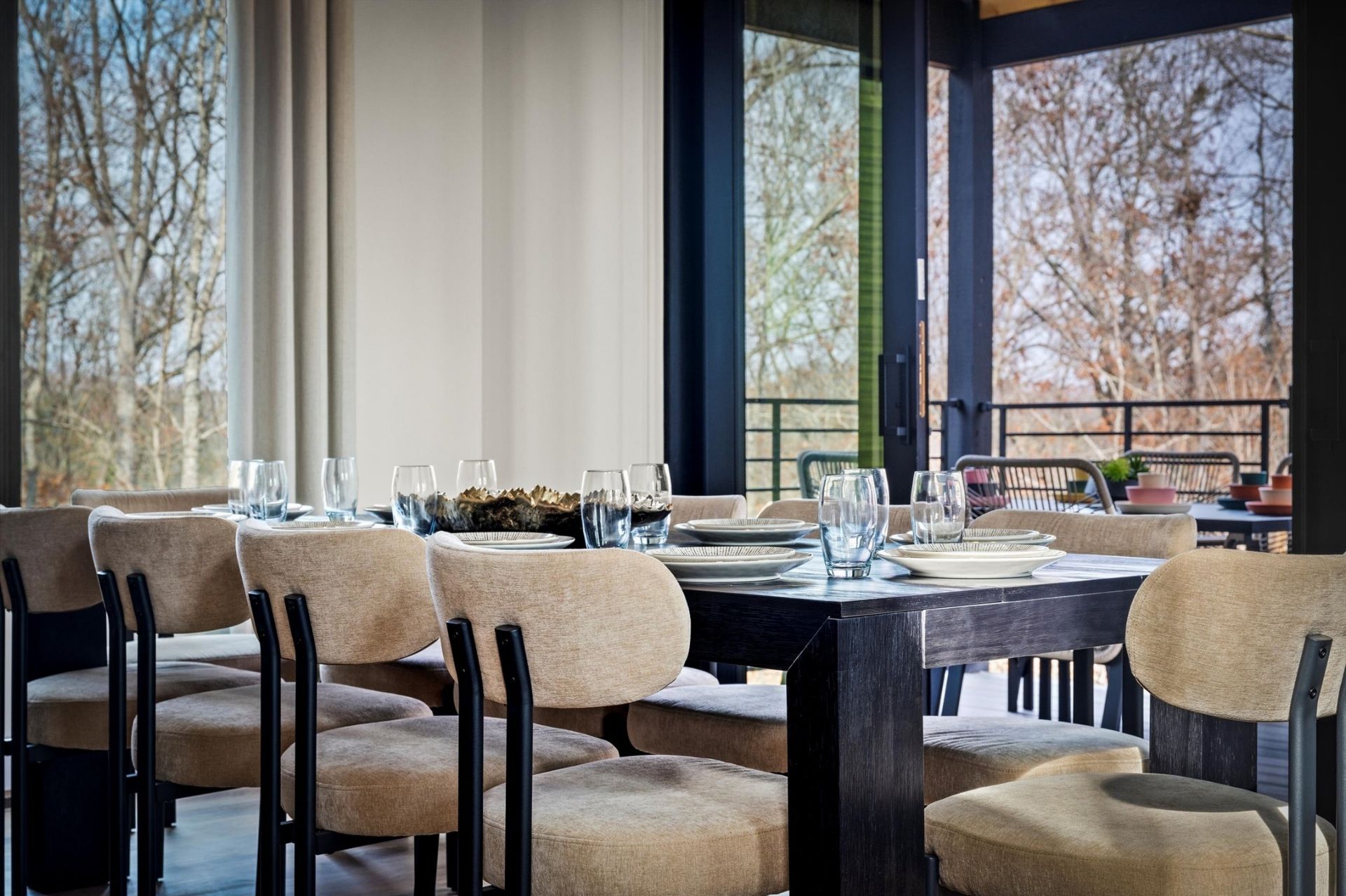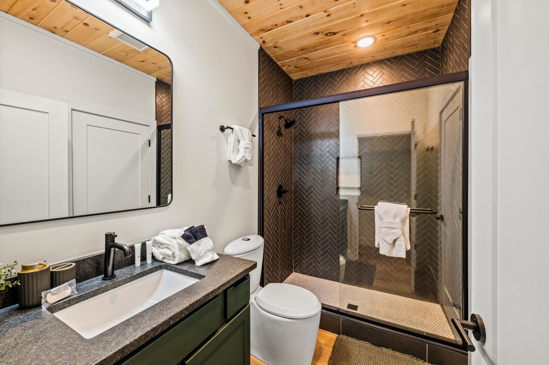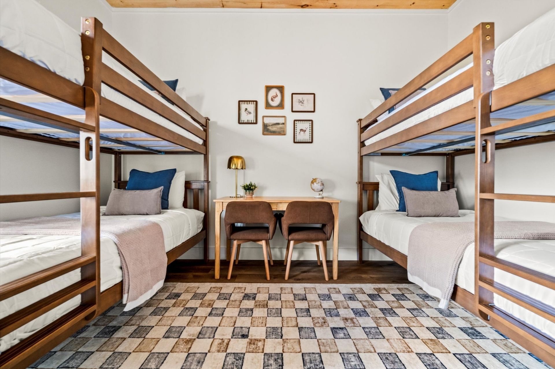 Inside, you’ll find four king bedrooms and a fifth bedroom featuring two sets of bunks, offering a comfortable and flexible layout for guests of all ages. The open-concept living, dining, and kitchen areas provide the perfect gathering space, complete with a fully equipped gourmet kitchen, large dining table, and cozy living room with a fireplace and Smart TV.