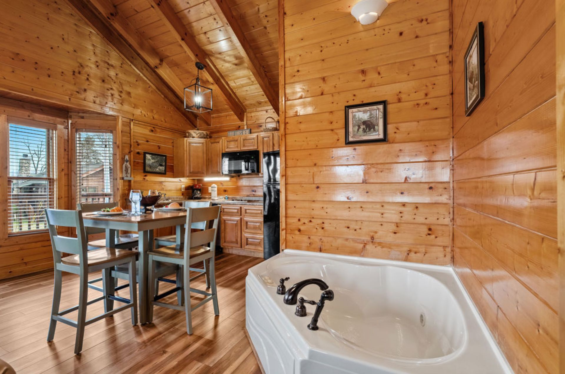 Inside, the open-floor-plan studio features warm wood interiors, a king bed, and a sleeper sofa suitable for two small children only. Unwind after a day of exploring in the indoor jacuzzi tub, and enjoy the convenience of a full bathroom with tub/shower combo. The compact yet well-equipped kitchen and dining area make it easy to enjoy meals in, while the comfortable living space is ideal for relaxing evenings.