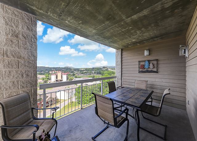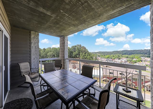 Beautifully decorated and thoughtfully designed, Lazy Days Retreat Whispering Pines 224 exudes a cozy “home away from home” atmosphere. After a day of exploring the Smokies, relax by the gas fireplace in the inviting living room and enjoy a movie on the large cable TV. The plush sofa also converts into a bed, providing additional sleeping space for two. Free Wi-Fi allows you to stay connected and share your favorite vacation moments online. The fully equipped kitchen features wood floors, modern countertops, and stainless-steel appliances, making meal preparation a breeze. Share a family dinner or play board games around the spacious dining table, then step out onto the private covered balcony with a glass of wine to enjoy scenic views of Pigeon Forge.