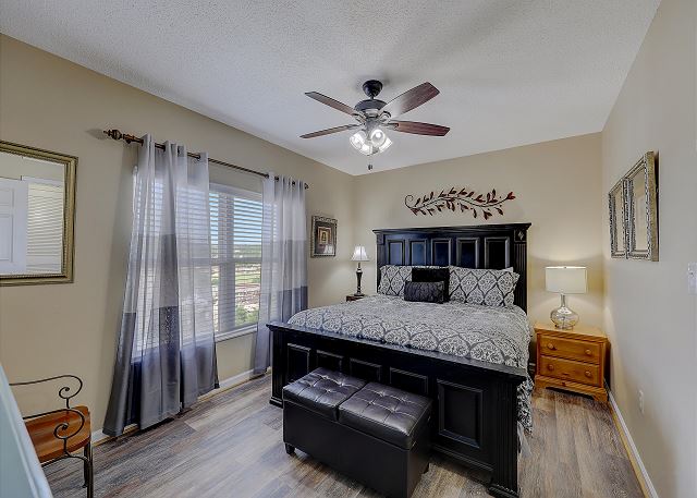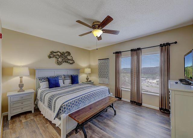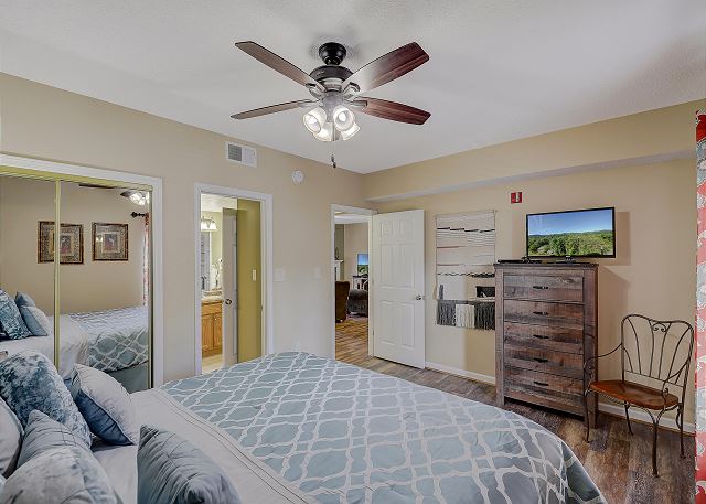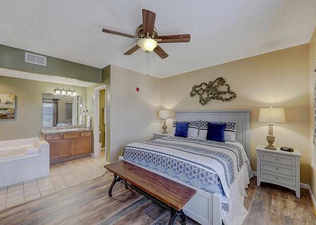 Each of the three tastefully furnished bedrooms offers a king-size bed, flat-screen TV with DVD player, ceiling fan, and reading lamps, ensuring everyone has a comfortable retreat. The primary bedroom includes an en-suite bathroom with a Jacuzzi tub, and both bathrooms are stocked with fresh, fluffy towels. For your convenience, there’s a washer and dryer, so you can pack light and make room for souvenirs.
