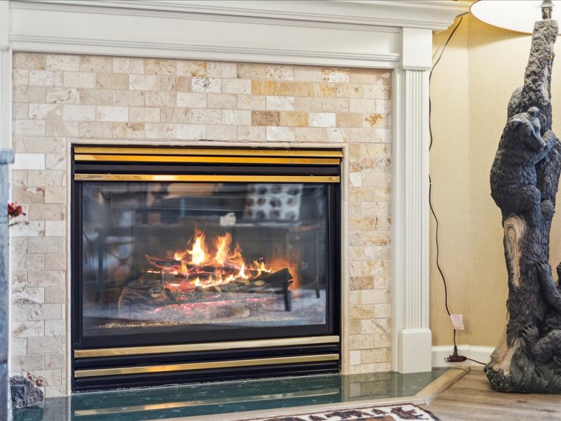 The open dining area comfortably seats four, making it the perfect spot for shared meals, games, or planning your next adventure. Just beyond, the living room invites you to kick back and relax with its warm hardwood flooring, a cozy seasonal gas fireplace that sets the mood on chilly evenings, a plush queen sleeper sofa for additional guests, and a comfortable recliner ideal for an afternoon nap or reading a good book.