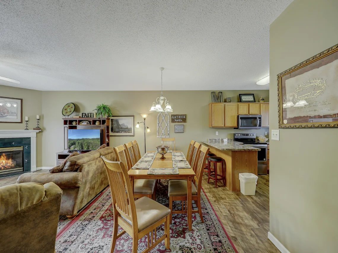 The spacious living room is ideal for the family to begin their adventure-filled day. The kitchen is fully equipped with everything you need to prepare breakfast. You can enjoy your meal together at the kitchen table or on the private balcony. After a day of fun, unwind by watching a movie in front of the seasonal fireplace. The sleeper sofa also provides extra sleeping space when needed.